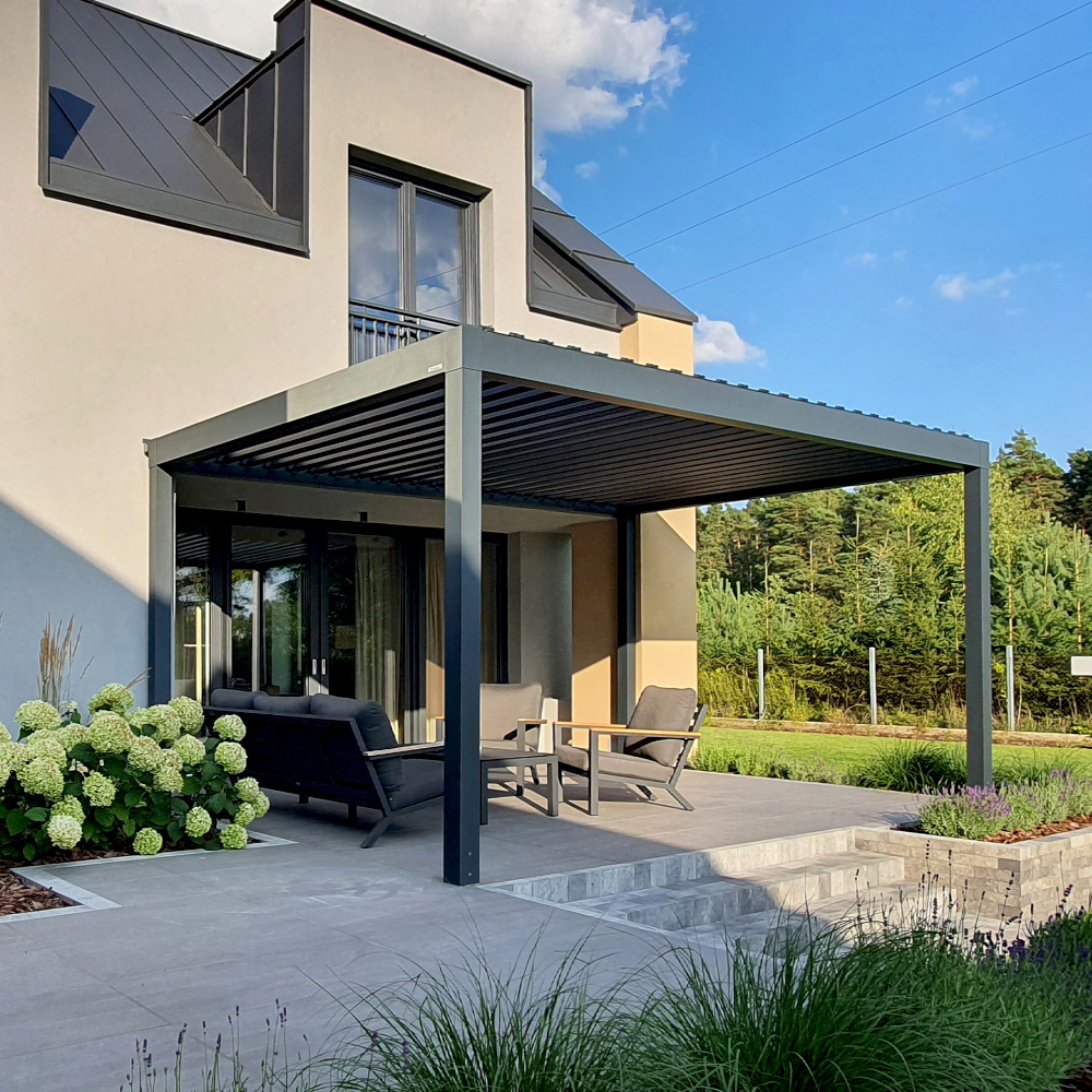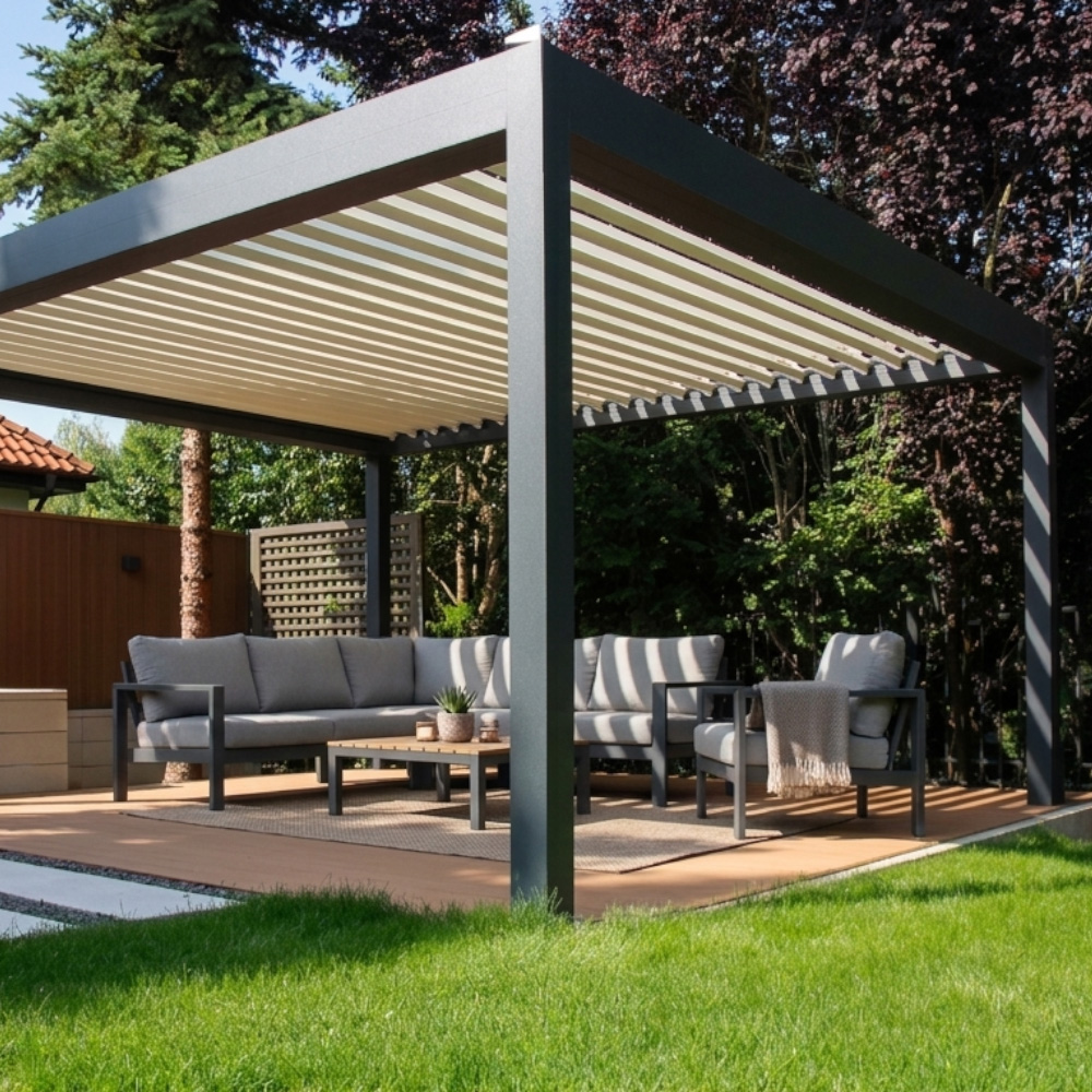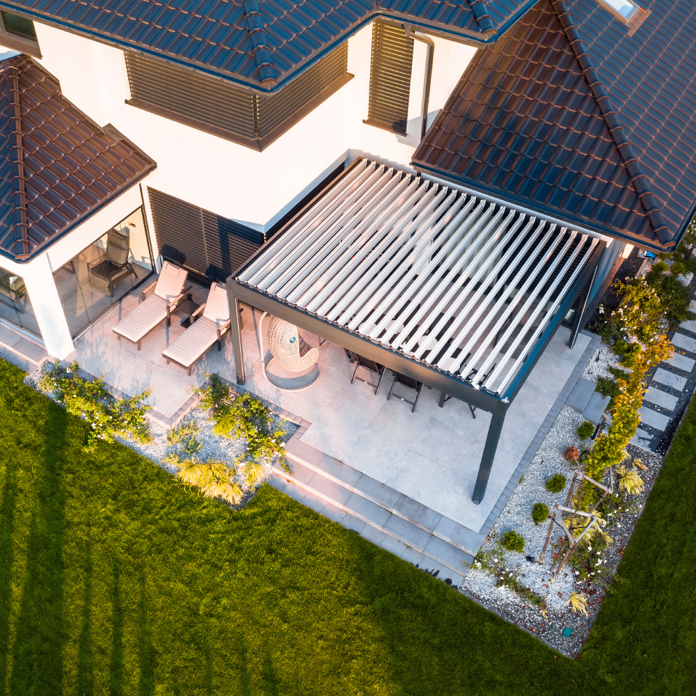 Unlike fabric awnings, our pergolas offer a permanent, intelligent design with adjustable water-proof roofs for total weather control.